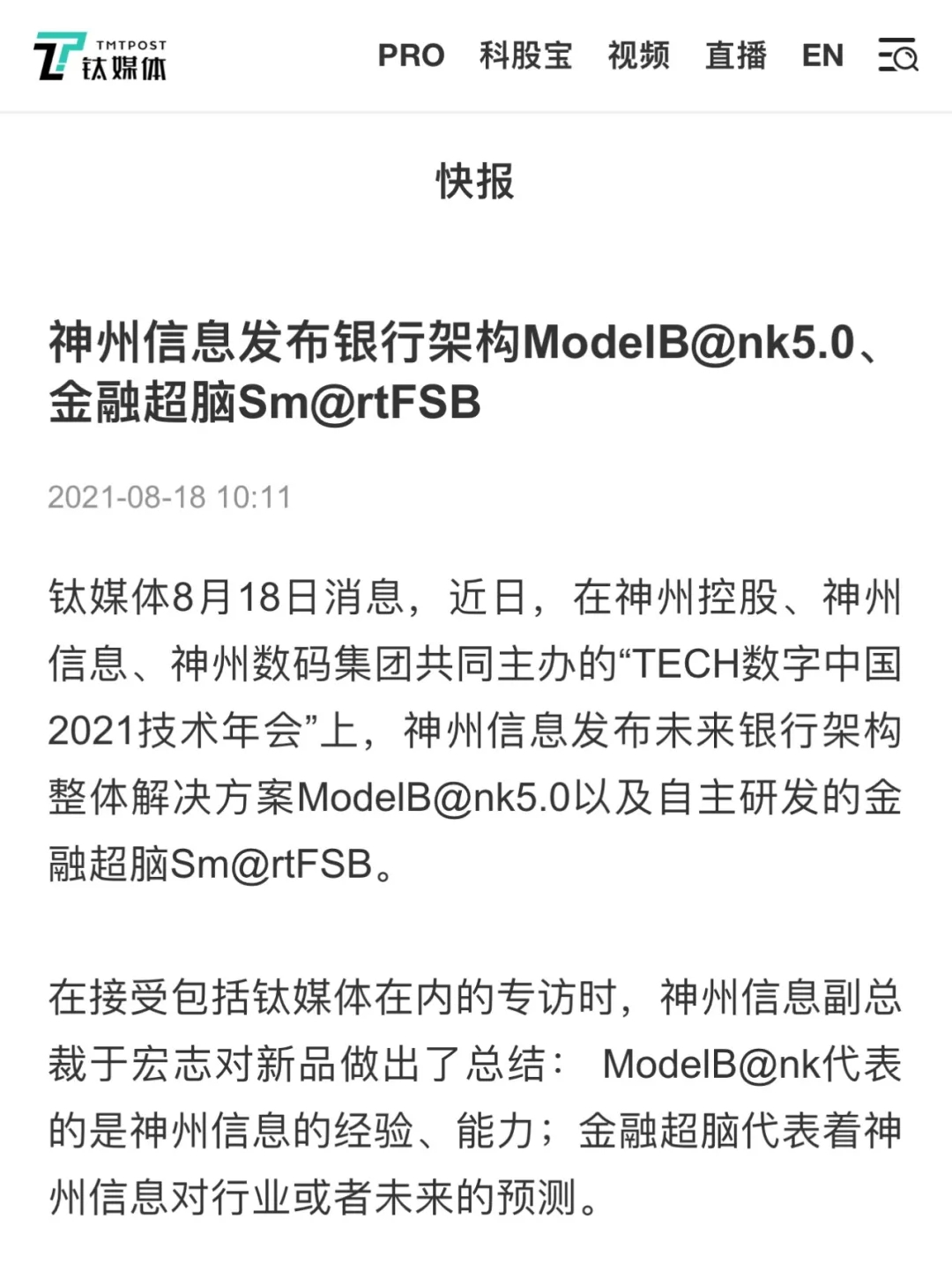 8月12日,由神州控股、BB贝博艾弗森官网、bb贝博艾弗森集团联合主办的“科技自强、数据融通、场景创新——TECH数字中国 2021技术年会”云上盛大启幕,发布神州信创云、ModelB@nk5.0、金融超脑Sm@rtFSB、云原生数字化安全底座、园区智能体等重磅产品,国内各大权威、影响力媒体多角度多频次对盛况进行报道!