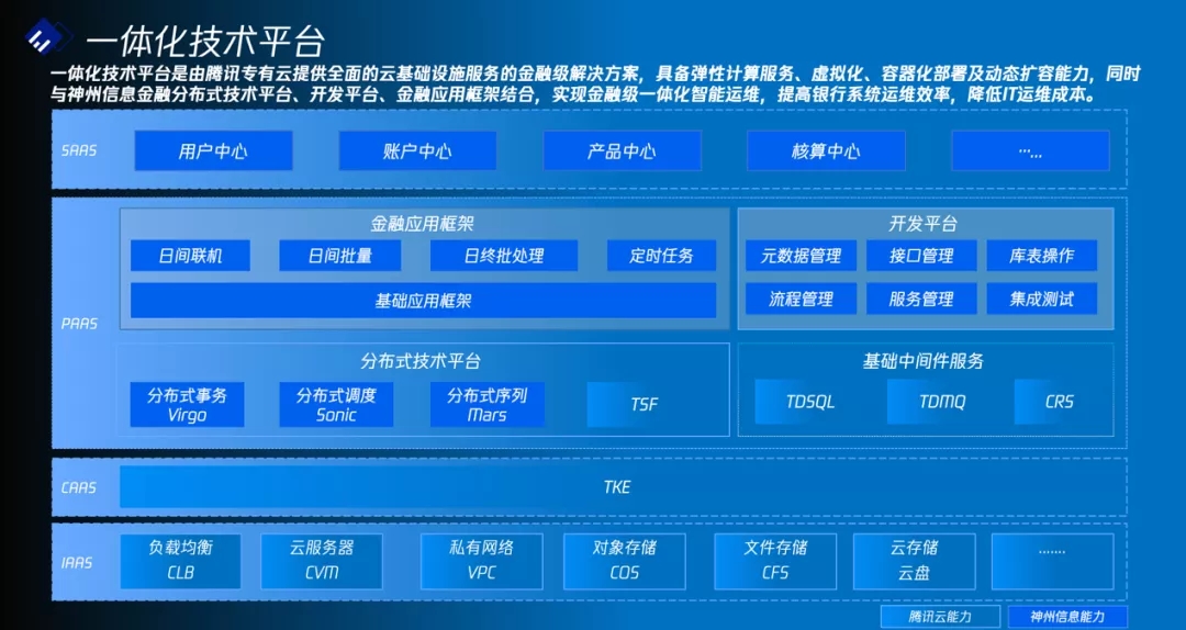 一体化技术平台是由腾讯专有云提供全面的云基础设施服务的金融级解决方案,具备弹性计算服务、虚拟化、容器化部署及动态扩容能力,包含自动化部署、系统监控、分布式协同、远程过程调用、任务调度和资源管理以及分布式文件系统,SAAS应用自助分析、链路监控、配置中心、业务集成化监控、应用生命周期管理等丰富的功能,同时与BB贝博艾弗森官网金融分布式技术平台、开发平台、金融应用框架结合,实现金融级一体化智能运维,提高银行系统运维效率,降低IT运维成本。